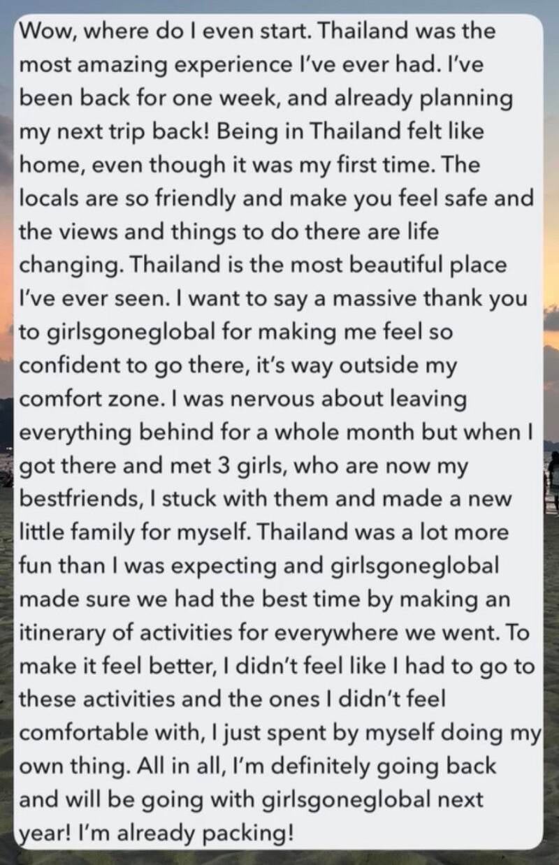 The amount of stuff there is to do is crazy, we did so much even in the first 2 weeks, we were so shocked. Activities are so cheap compared to anywhere I've ever been, and the experience and happiness you feel is 10x greater. It's impossible to run out of things to do here and half of them are free! When you go to different places in Thailand the vibes and scenery change in every place. ๐ฅณ